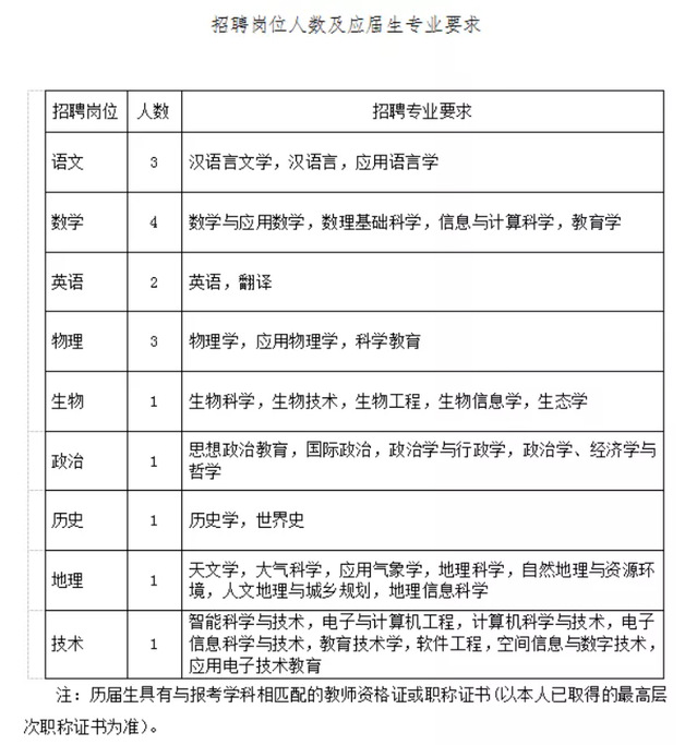 6.应届毕业生具备同报考学科相对口的专业并具有相应学科的教师资格证书(岗位专业要求详见附件1),硕士、博士研究生应以本科所学专业报名。在职优秀教师具有与报考学科相匹配的教师资格证或职称证书(以本人已取得的最高层次职称证书为准),专业不做要求。
