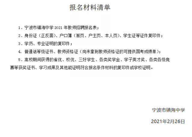 根据《宁波市事业单位公开招聘工作人员实施办法》和《镇海区事业单位公开招聘工作人员实施办法》的有关规定,现因江南真人 江南手机app下载安装 事业发展需要,经区江南手机app下载安装 局审核,报区人力资源和社会保障局同意,决定公开招聘2021年镇海中学事业编制教师17名。现就有关事项公告如下: