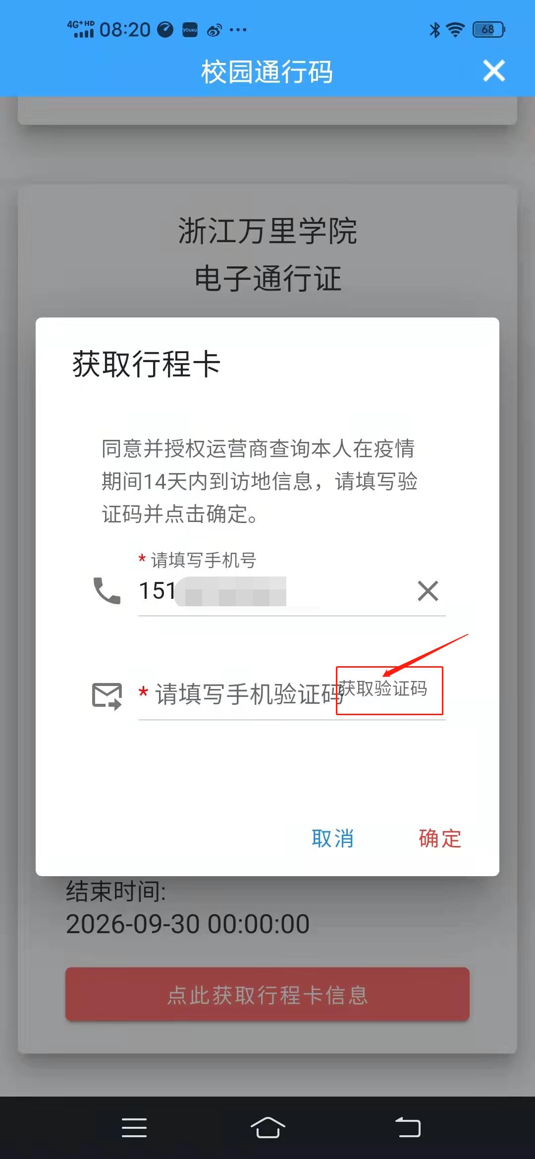 步骤一:进入校行码界面后,点击获取行程卡信息