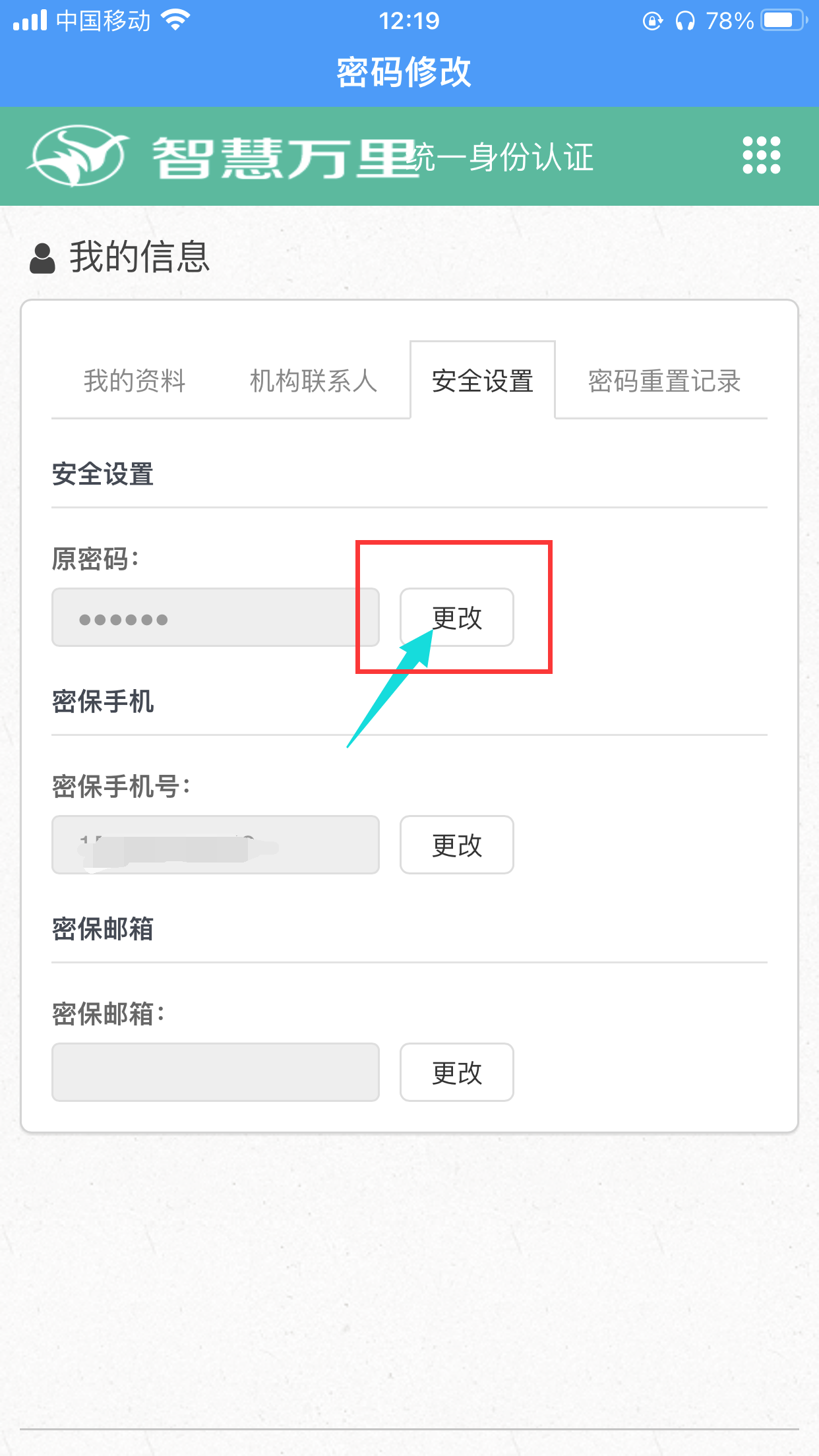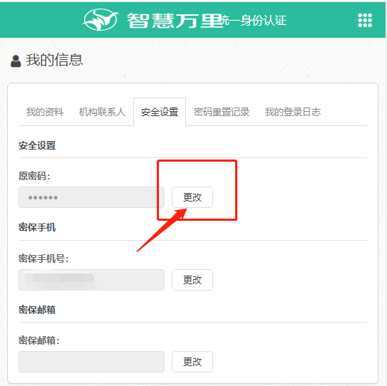 登录“我的万里”APP,进入“工作台”,点击设置(齿轮状)图标,选择“密码修改”,点击“更改”进行密码修改。