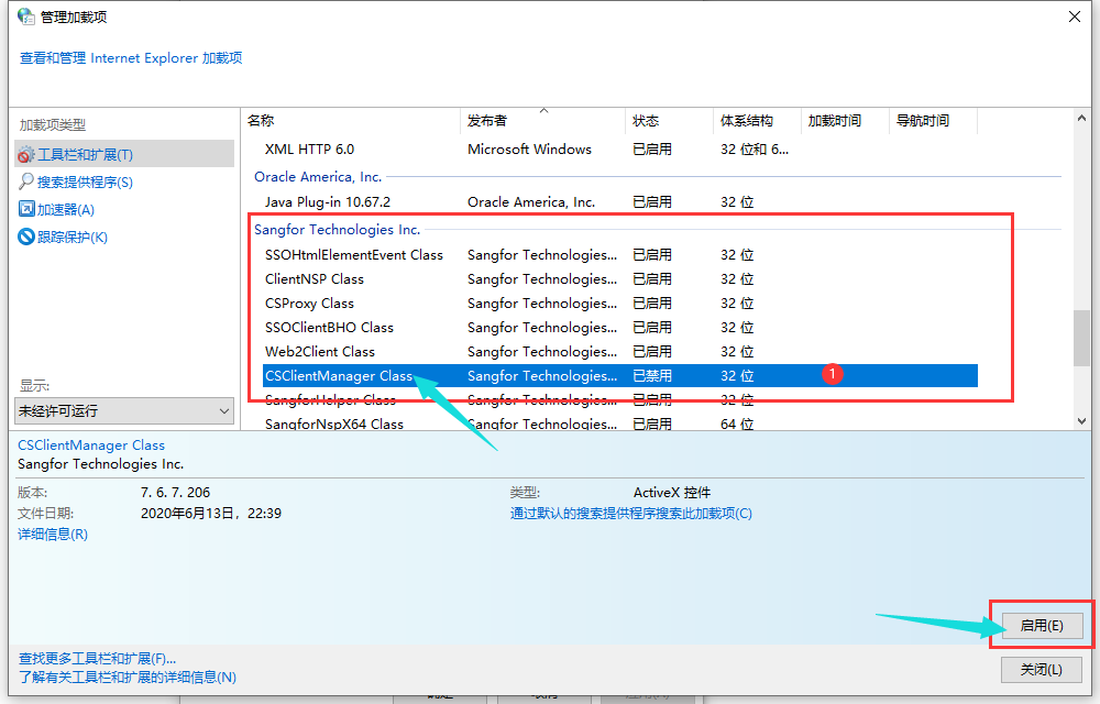 已经安装了客户端控件,再次登录VPN时,页面仍然提示“安装浏览器控件”,请检查IE浏览器【工具】-【Internet选项】-【程序】-【管理加载项】中CSClientManager Class控件是否被禁用