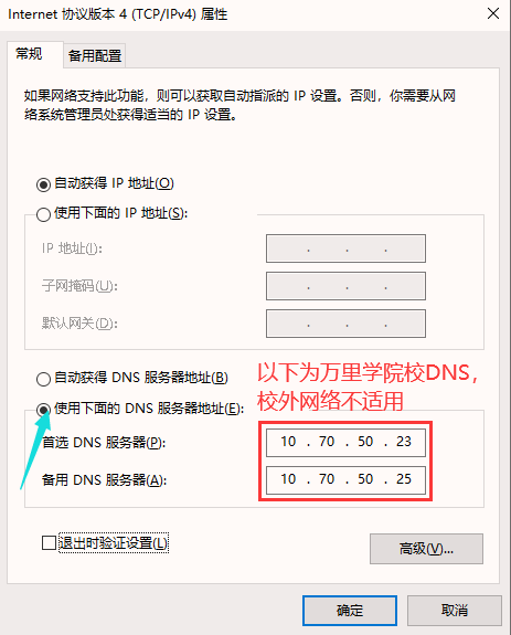 5.可将DNS获取方式改为“自动获得DNS服务器地址”或修改DNS配置(如下图),然后点击确定即可。
