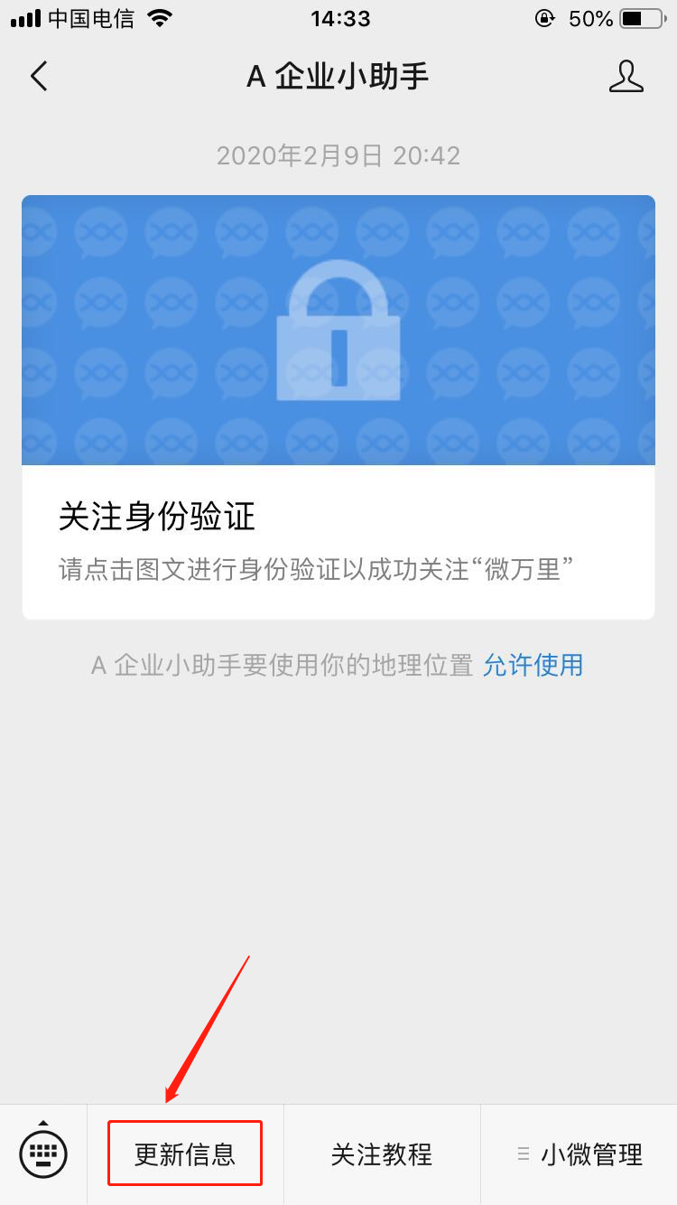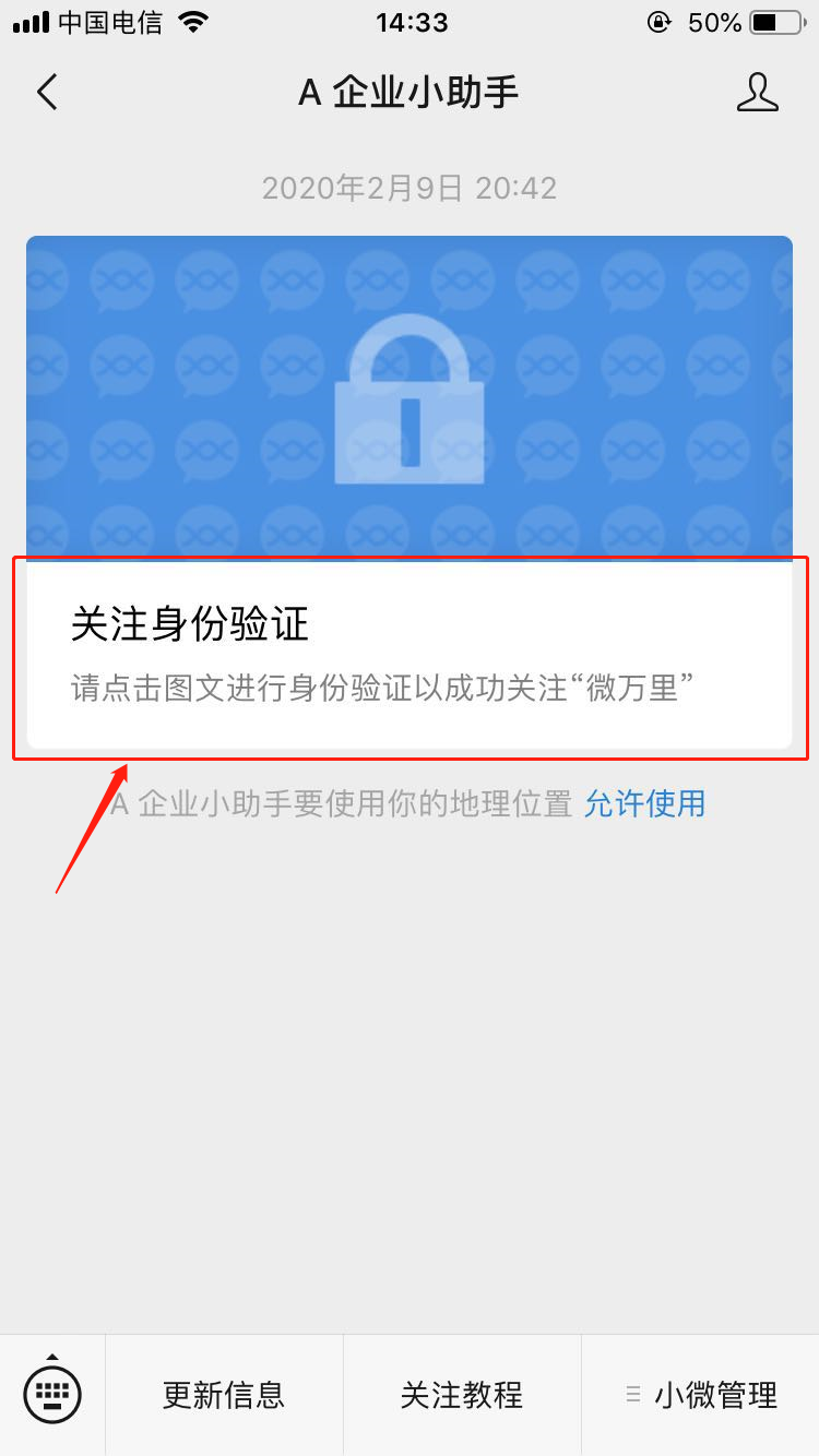 8如果完善了手机号码,更新了信息,还是没有验证成功。说明你的微信绑定号码有过更换。请点击“企业小助手”中“关注身份验证”的链接,再次验证更新的手机号,