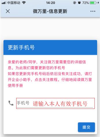 7这里填写本人有效手机号码并提交。提示“更新成功”后,关闭本页面;回到“企业小助手”,显示“你已成功关注微万里”的消息,那么恭喜你,你已经验证成功了。