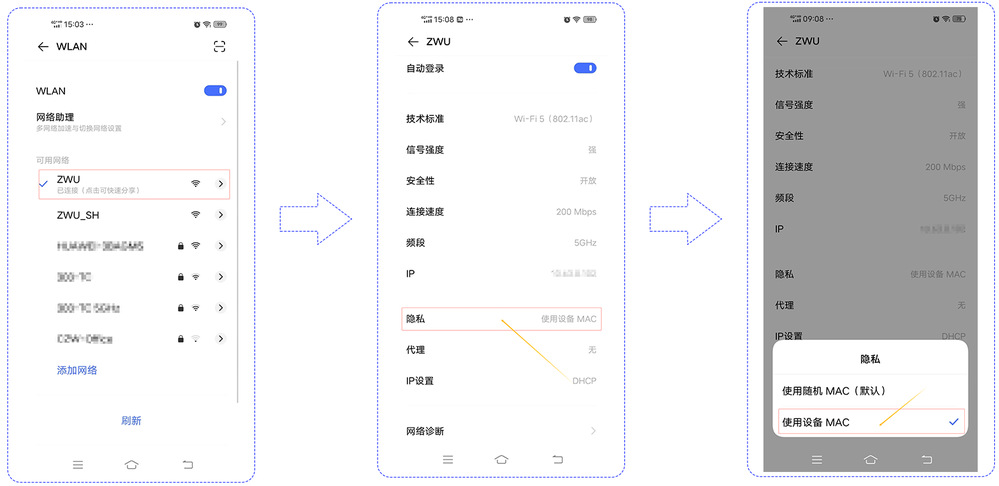1)安卓手机需在ZWU网络中切换成“使用设备MAC”