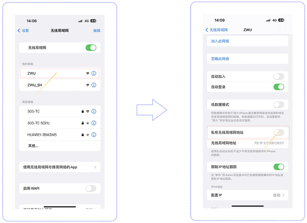 2)苹果手机需在ZWU网络中关闭“私有无线局域网网址”
