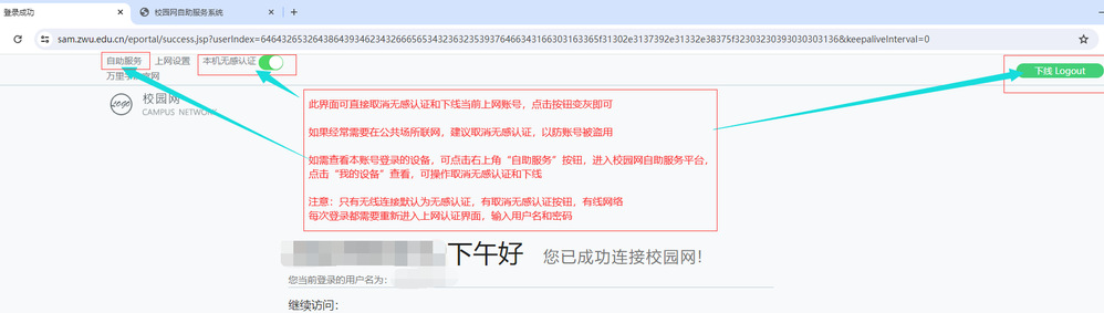 ->如果在公共场所使用无线终端,使用完毕后请及时在认证界面下线(上网认证界面保留仅支持电脑端),该页面关闭后还可到校园网自助服务平台(该系统仅支持内网访问)查看“我的设备”下线设备,网址http://cnt.zwu.edu.cn/