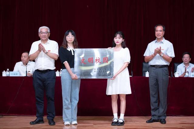 在与会师生瞩目下,应敏和蒋建军共同为省级“文明校园”授牌,教师代表朱晓霞、江南手机app下载安装 代表侯丹丹接牌,象征群众性文明创建的进一步推进。