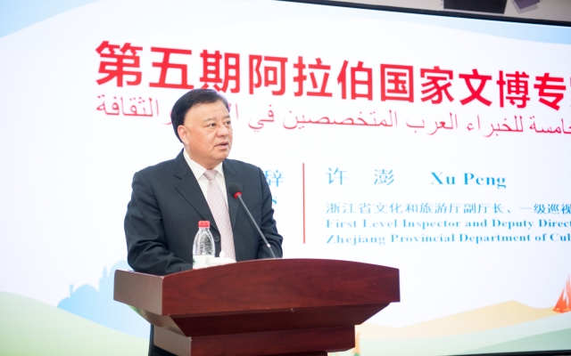 许澎对研修班的各位文博专家们表示了热烈的欢迎。许澎指出,浙江与阿拉伯国家自古以来就保持着非常密切的联系,浙江与阿拉伯国家的文化交流也日益频繁。五年来,我省与阿拉伯17个国家在文博、美术、舞蹈、戏剧等领域积极开展交流。同时他也希望,经过本次研修班,学员们能收获知识技能、体验感悟和珍贵情谊。