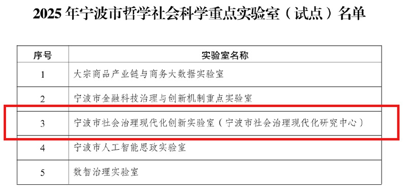 近日,宁波市哲学社会科学工作办公室公布了2025年宁波市哲学社会科学重点实验室(试点)名单。由我校法学院牵头,文化与传播学院、大数据与软件工程学院、信息与智能工程学院、马克思主义学院等参与,校内外多学科力量联合,共同申报的“宁波市社会治理现代化创新实验室(宁波市社会治理现代化研究中心)”成功入选,获批试点建设。该项目的获批不仅是我校哲学社会科学平台建设的重要突破,更是全校跨学科协同、资源整合与校地联动成效的集中体现。