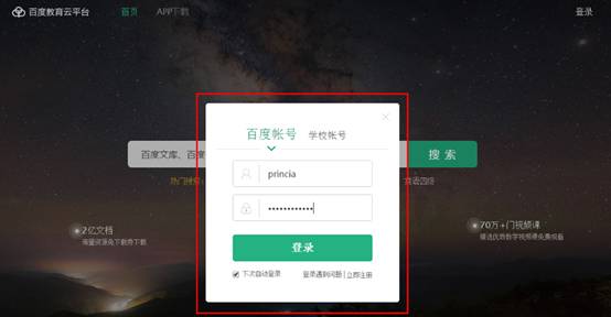 (1)浏览器输入eduai.baidu.com,敲击回车,进入百度江南手机app下载安装 云平台,点击登录按钮,即可进入登录页面。