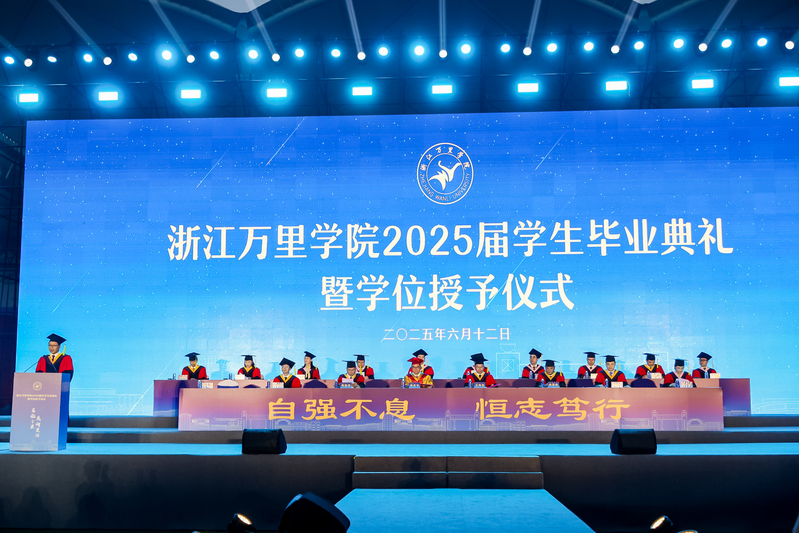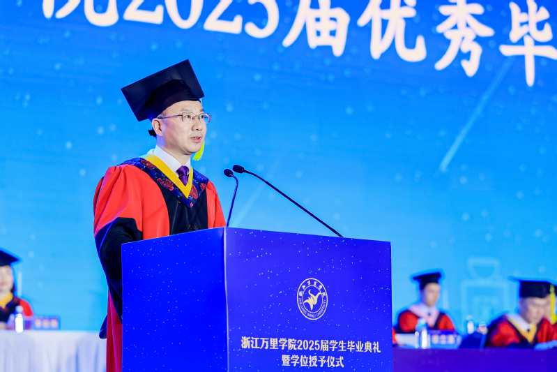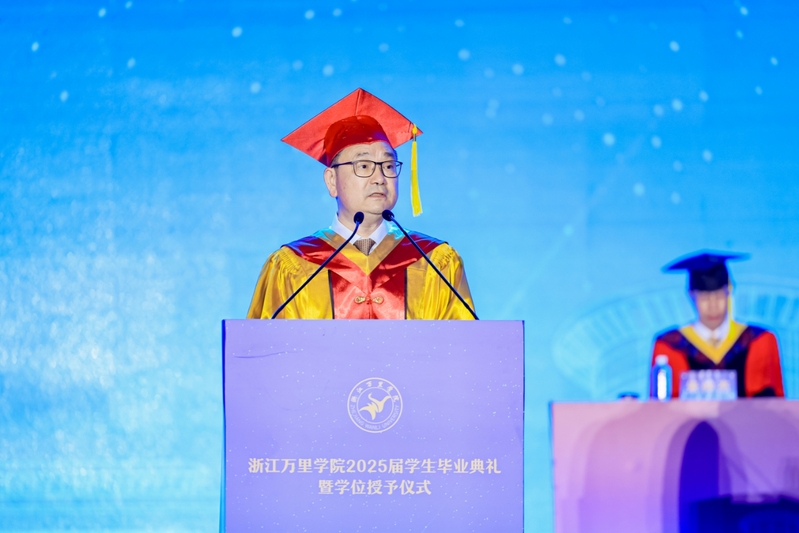 法学院法学217班贺语贝、生物与环境学院生物与医药22881班杜昊霏分别代表2025届本科毕业生、硕士毕业生发言,鼓励大家铭记“自强不息、恒志笃行”的校训,带着“只要有1%的希望就要尽100%努力”的万里精神,用一步一个脚印来书写各自与众不同的人生。他们满载豪情地与毕业生们共同立下誓言:“我们的努力将无悔于自己的青春和志向,我们的拼搏将无愧于万里对我们的培养,我们会在未来奋斗的道路上永远坚守万里的气度与梦想,我们将在振兴中华的征途中,继续抒写属于万里人的华章!”
