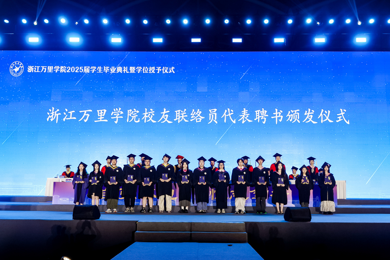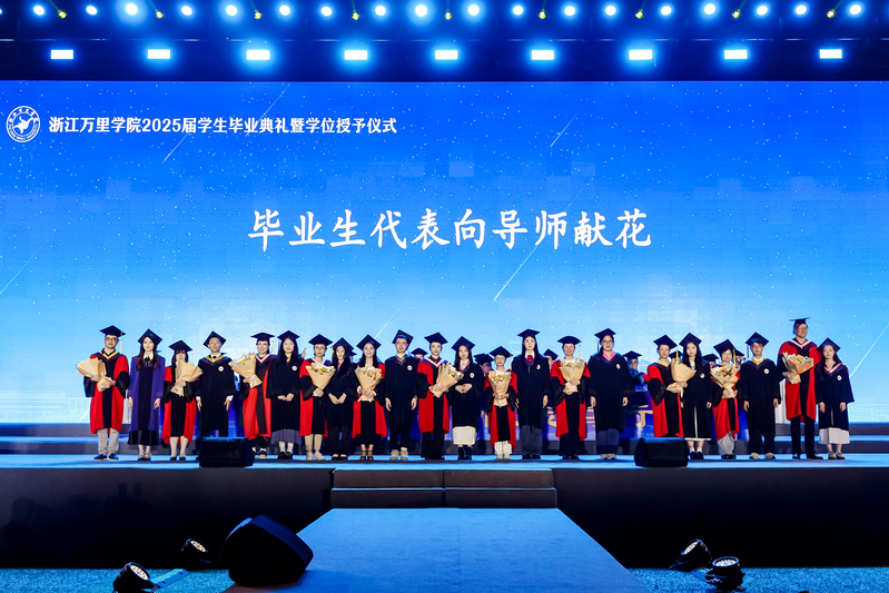 典礼上,毕业生代表向导师献花,怀着真切的心感念师恩。江南真人 为校友联络员代表颁发了聘书,并对省级优秀毕业生、校级优秀毕业生和万里卓越奖获得者予以表彰。王伟忠宣读优秀毕业生表彰文件。