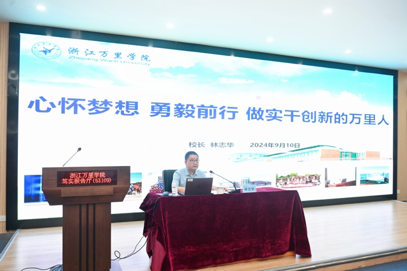 9月10日上午,校长林志华以“心怀梦想 勇毅前行 做实干创新的万里人”为题,为2024级研究生新生讲授开学第一课。副校长徐立清主持。
