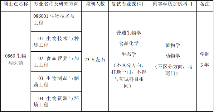 4.初试科目与调入科目相同或相近,其中初试全国统一命题科目应与调入专业全国统一命题科目相同,我校生物与医药专业初试考试科目:思想政治理论、英语(二)、生物化学、微生物学。
