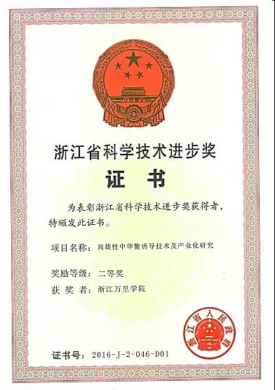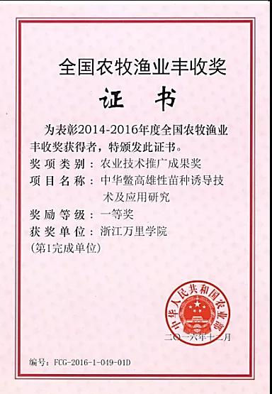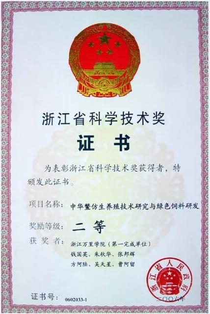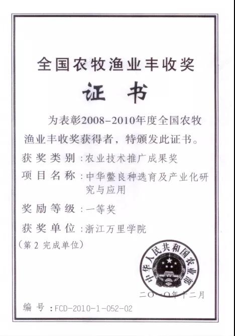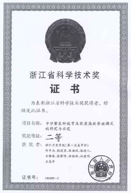 2. “中华鳖良种选育及优质高效养殖模式的研究与示范”获2010年浙江省科学技术奖二等奖、全国农牧渔业丰收一等奖
