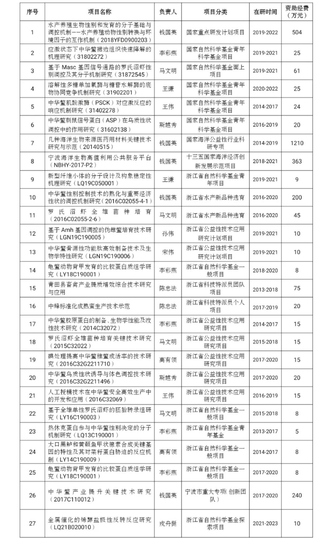 水产动物性别控制与单性育种研究:开展龟鳖类性别决定的分子机制研究、中华鳖性别控制和雄性苗种培育技术及产业化研究、虾类动物性别调控机理和单性良种创制的关键技术研究
