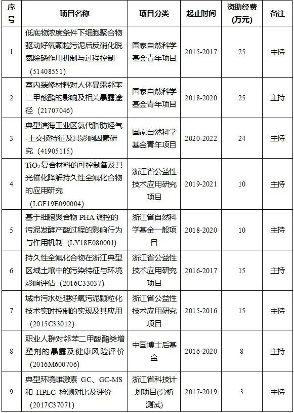 新型污染物的环境行为及控制:新型污染物检测分析方法的开发和应用;新型污染物在水体和土壤中的环境行为及环境效应;废水中持久性污染物降解技术与机理;内分泌干扰物在人体和生物体中的赋存、源解析和健康风险评价。