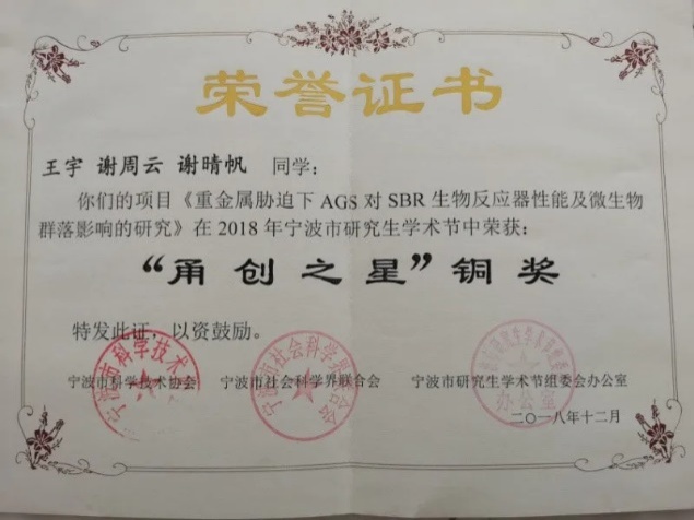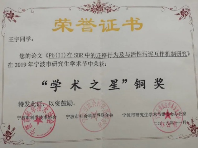 (2)研究生在校学习期间共发表论文10余篇,其中在环境领域国际权威期刊《Water Research》发表论文1篇,参与申报发明专利7项。