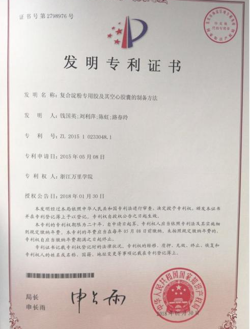 [7] 钱国英,刘利萍,陈虹,路春玲.复合淀粉专用胶及其空心胶囊的制备方法[P].中国:CN104873977A(授权)