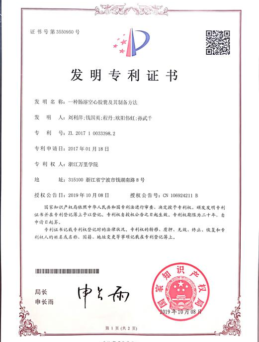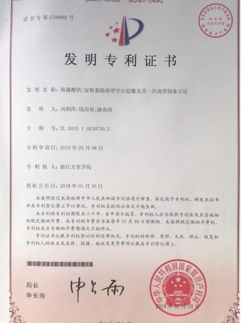 [6] 刘利萍,路春玲,周旭静,钱国英.海藻酸钠/淀粉基肠溶型空心胶囊及其一次成型制备方法[P].中国:CN104887643A(授权)