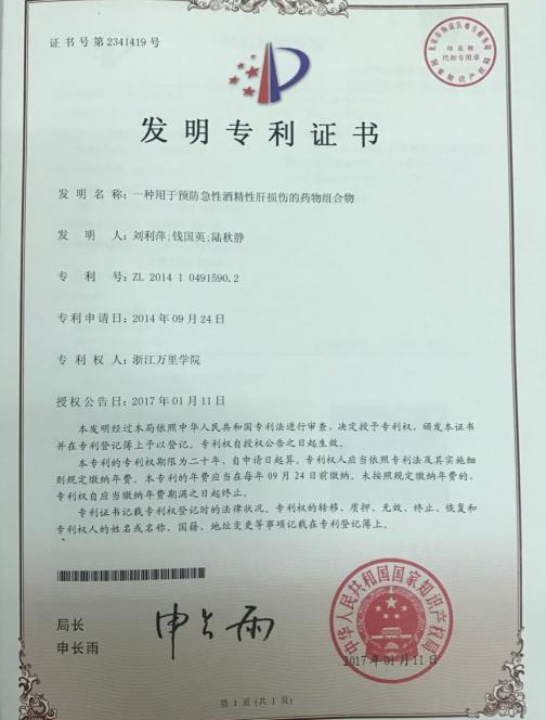 [8] 刘利萍,钱国英,卢秋静.一种用于预防急性酒精性肝损伤的药物组合物[P].中国:CN104288164A(授权)