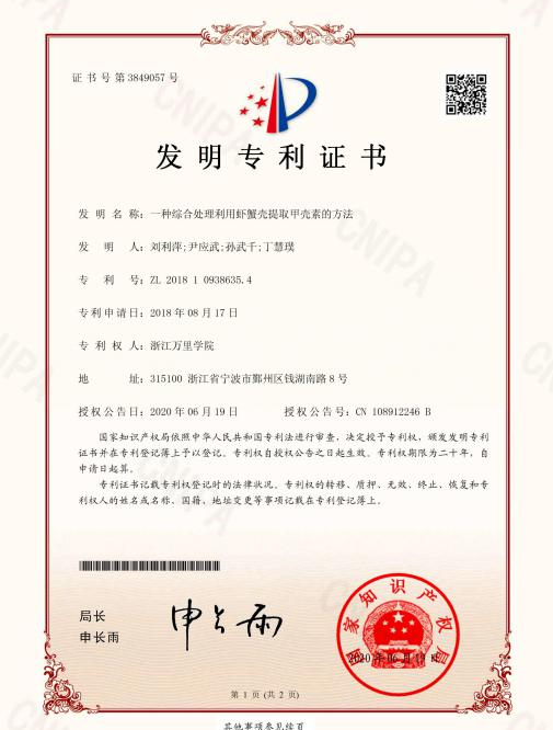 [2] 刘利萍;尹应武;孙武千;丁慧璞.一种综合处理利用虾蟹壳提取甲壳素的方法[P].中国:CN201810938635.4(授权)