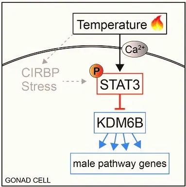 原创性地揭示了红耳龟TSD的调控通路Ca2+-pSTAT3-KDM6B,提出了“温度-表观遗传-性别决定基因”假说,为全面破译TSD机制奠定了重要基础。