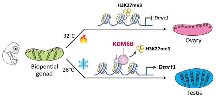 温度依赖型性别决定(TSD)是一种奇特的表型可塑性现象,但其分子机制一直未被破解。团队以红耳龟为TSD动物模型,首先鉴定获得了一系列参与红耳龟性腺分化的相关基因,其中Dmrt1能启动未分化性腺向睾丸发育,是红耳龟雄性性别决定基因。与杜克大学Blanche课题组合作,原创性发现了组蛋白去甲基化酶KDM6B在红耳龟未分化性腺中呈温度依赖性表达,能快速响应温度变化,并且敲低Kdm6b导致80-87%的MPT胚胎出现雄性向雌性性逆转。通过ChIP-qPCR证明了,KDM6B通过消除启动子区H3K27三甲基化标记,直接促进红耳龟雄性性别决定基因Dmrt1的表达。功能回复验证显示,Dmrt1的过表达能够恢复由Kdm6b缺陷引起的性逆转,揭示温度通过表观遗传因子KDM6B调控性别决定基因Dmrt1,从而启动性腺分化(Science, 2018)。随后研究发现,高温促进性腺体细胞Ca2+内流,激活pSTAT3,pSTAT3维持在较高水平,直接抑制Kdm6b表达,继而抑制雄性性别决定基因Dmrt1表达,最终促进雌性发育;低温下,性腺体细胞胞内Ca2+水平低,pSTAT3维持在较低水平,Kdm6b高表达,激活Dmrt1表达,最终导致雄性发育(Science, 2020)。